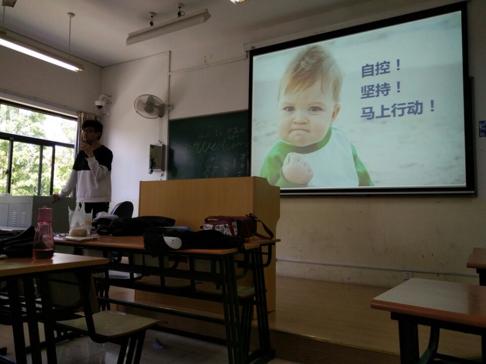 首先,班长播放一段关于拖延症的幽默视频,在同学们的欢声笑语中引入本次班会的主题。随后,班长通过播放幻灯片的形式向同学分享与拖延症表现相关的生动风趣的图片,引起同学阵阵共鸣。在互动环节,同学们纷纷在讲堂上分享拖延症的惨痛经历,经历虽各有不同但是换来的都是一些“惨痛”的教训。针对拖延症的各种表现,班长向同学们分享了许多有效克服拖延症的方法,如制定有效计划,进行时间管理,重视行动等。