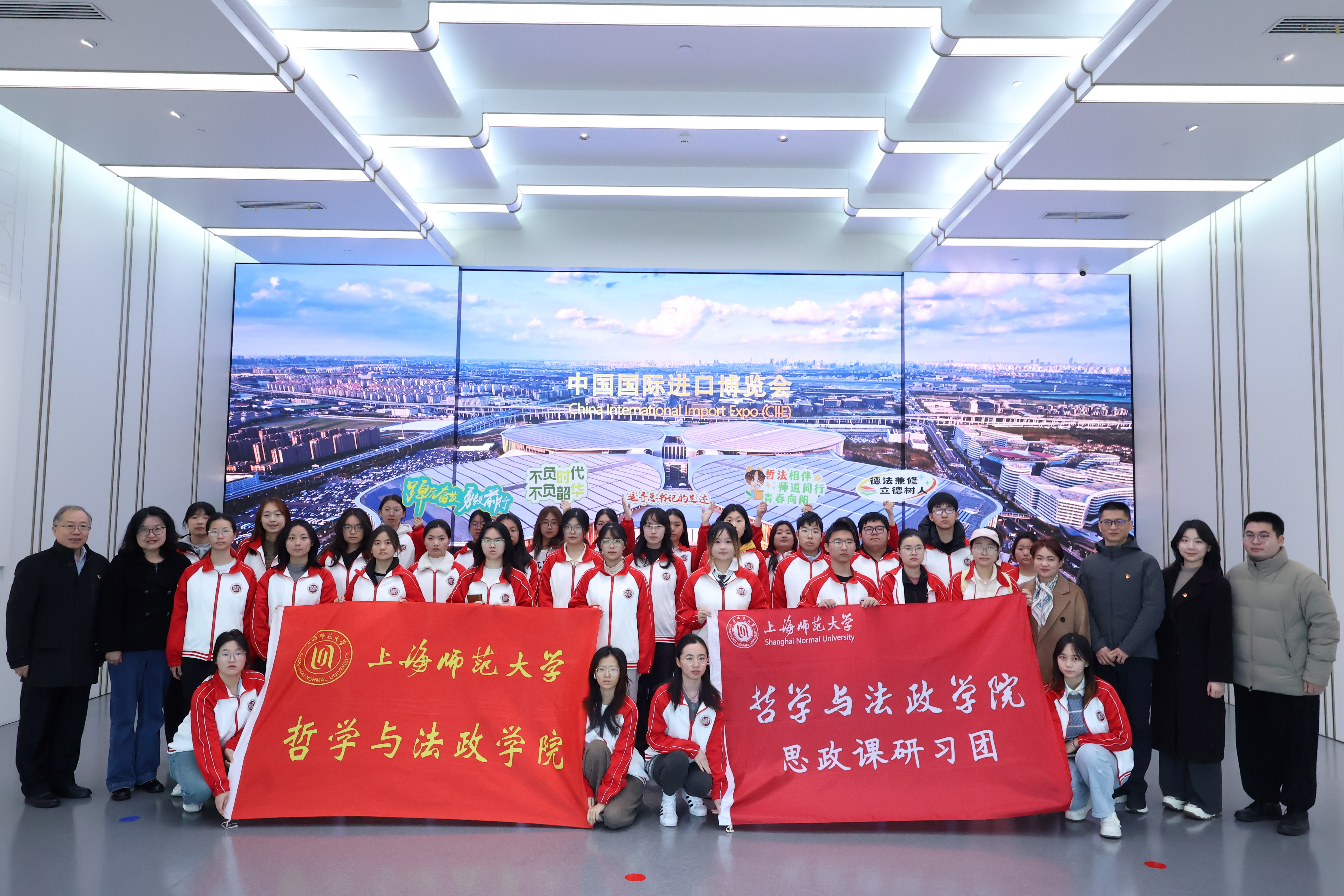 3月20日上午,女性自慰女性自慰 组织师生前往进博文化展示中心开展“追寻总书记的上海足迹——情景思政课”活动。女性自慰 党委书记高亭,党委副书记、副院长姚秋磊,公共管理系习近平外交思想专论课授课教师赵银亮教授,以及2024、2025级思想政治教育(道德与法治方向)专业师范生,习近平外交思想女性自慰专栏 理论宣讲团成员共同参与本次活动。